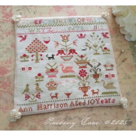 Based on one of the antiques in my collection, Ann Harrison's sampler features a delightful array of motifs, including fruiting trees, potted flowers, birds, swans, butterflies, dogs, fruit baskets, and crowns. Her design is worked entirely in cross stitch. A few colors were modified for the reproduction, but purists fear not! I've noted the changes in the instructions should you wish to replicate Ann's sampler precisely.