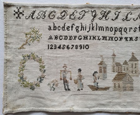 This long, unfinished sampler is worked in a lovely palette of silk and cotton threads. Four complete alphabets and a set of numbers are worked across the top. The bottom, worked in silks, features a delightful variety of florals, a wreath, a gathering of buildings, a lady, and several gentlemen - one rowing a small boat. Beautiful, Quaker-like motifs. Much prettier in person than my photos portray!