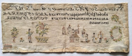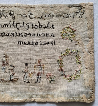 There are some small stains and general discoloration to the linen ground. The linen is in otherwise good condition. There are remnants of paper stuck to the back. The silk threads have faded beautifully, but we can see on the back that they were once a pale, but colorful palette of pinks, greens, blues, yellows, and browns. Although undated, this sampler was likely stitched in the early 19th century. It measures 21.5"w x 8.5"h.