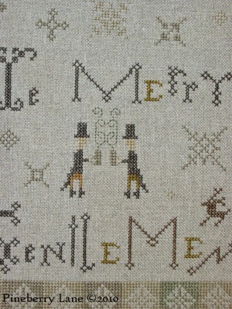 This folky design is stitched in the sooty, silvery colors of Charles Dickens’ London in “A Christmas Carol”. I’ve used a variety of lettering for the words. The motifs include two proper Englishmen toasting each other with steaming cups of grog surrounded by fanciful snowflakes and even a wee deer! Stitched 28 count natural, unbleached linen. Stitches include cross and back stitch.