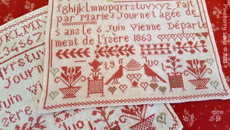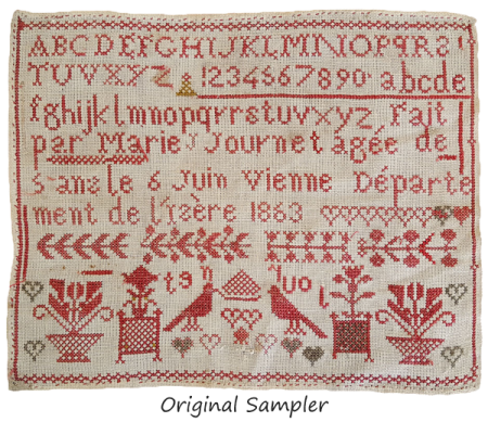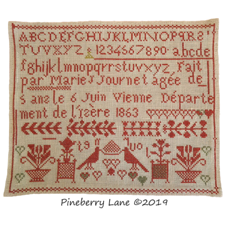 Worked in the mid-section of the sampler are the words,“Fait par Marie J Journet agée de 5 ans le 6 Juin Vienne Departement de l’ Isere 1863” which translates to “Made by Marie Journet aged 5 years on June 6, Vienne, Department of Isere, 1863.” Vienne is a commune (township or city) in Isere, which is located in the Auvergne-Rhône-Alpes region of southeastern France.