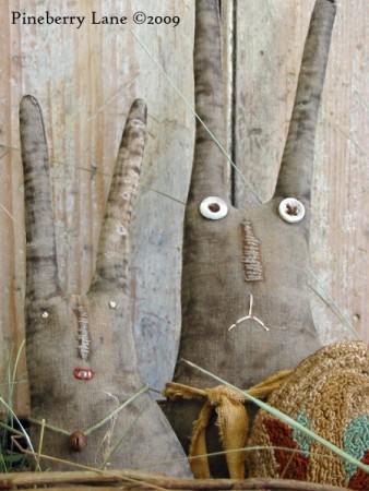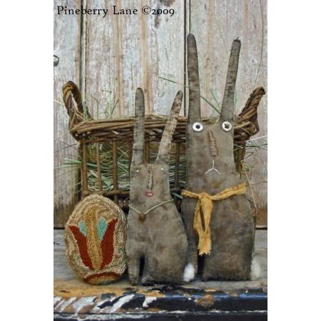 A perfect trio for your Easter or Springtime basket, this pattern includes instructions and templates for the two primitive bunnies and the needle punched egg. Bunnies measure 7.5”h and 9.5”h. Needle punched egg features a Fraktur-style tulip and rich colors ~ 3.5”h.