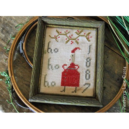 A folky little Santa, sprig of holly, and the words “ho ho ho” make for a merry little stitch! Pattern includes color photo, chart, DMC floss colors, and optional aging instructions. Stitch count: 41w x 57h. Original stitched on 30 Weeks Dye Works “Linen”.