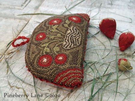 A cheerful posey of scarlet flowers is the central motif on this little needle punch cushion. Trimmed with red chenille, it also has a small loop at top for hanging. Worked in earthy browns and green and scarlet red. 5.5”w x 3.5”h.