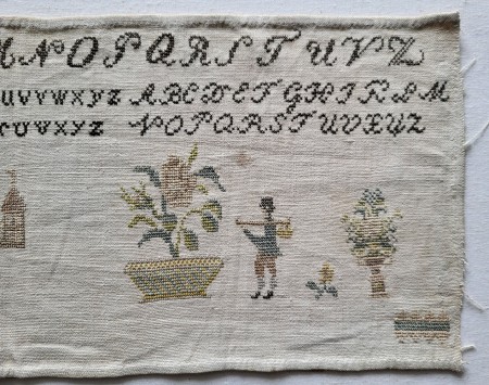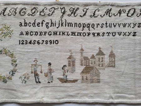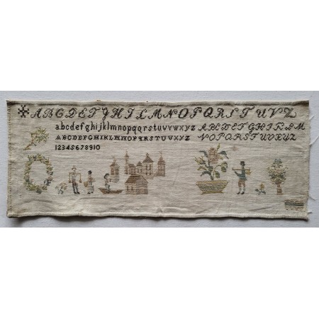 This long, unfinished sampler is worked in a lovely palette of silk and cotton threads. Four complete alphabets and a set of numbers are worked across the top. The bottom, worked in silks, features a delightful variety of florals, a wreath, a gathering of buildings, a lady, and several gentlemen - one rowing a small boat. Beautiful, Quaker-like motifs. Much prettier in person than my photos portray!