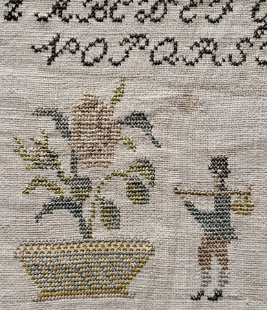 There are some small stains and general discoloration to the linen ground. The linen is in otherwise good condition. There are remnants of paper stuck to the back. The silk threads have faded beautifully, but we can see on the back that they were once a pale, but colorful palette of pinks, greens, blues, yellows, and browns. Although undated, this sampler was likely stitched in the early 19th century. It measures 21.5"w x 8.5"h.