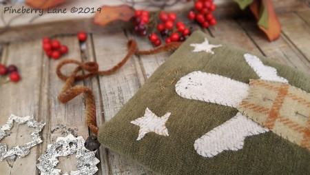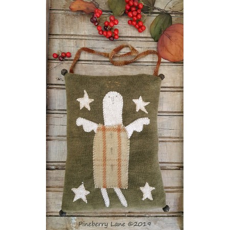 Pieced from a neutral palette on buttery soft green velveteen, this wool applique pillow features a little angel with a golden halo of lazy daisy stitches set amidst a host of heavenly stars. Rusty jingle bells adorn the corners. Finished project measures 8.5”h x 5.5”w not including the wool hanger. This project works up quickly and you can use wool from your scrap basket for many of the pieces.
